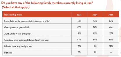 An overwhelming 88% of Iranian Americans report having family members currently living in Iran, including 26% with immediate relatives such as parents, siblings, or children. Among those who immigrated within the past 25 years, nearly 50% still have immediate family there.