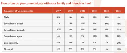 Communication with family members in Iran remains frequent despite obstacles. Sixty-one percent speak with relatives at least several times a year, and 43% do so monthly or more often.