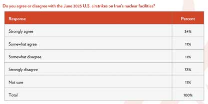 Iranian Americans are evenly divided over the June 2025 U.S. airstrikes on Iran’s nuclear facilities: 45% agree with the strikes and 44% disagree. Among opponents, 56% cite fear of civilian casualties as their main concern.