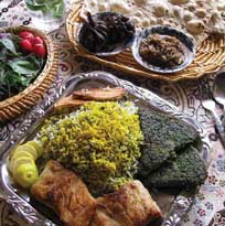 “The following dishes are traditionally served on the eve of the Iranian New Year- Nowrouz. Polo is prepared exactly the same way as Chelow [white rice recipe, Peyk #107], but in order to maintain the light, fluffy quality of the rice, boil the rice in polo recipes for only 2 minutes, instead of 3-4. It is important not to over cook the rice, as the other ingredients mixed in any polo recipe will tend to make the rice soft.” In addition to the three main dishes listed here, we can also add Ash e Reshteh (Peyk #156).
